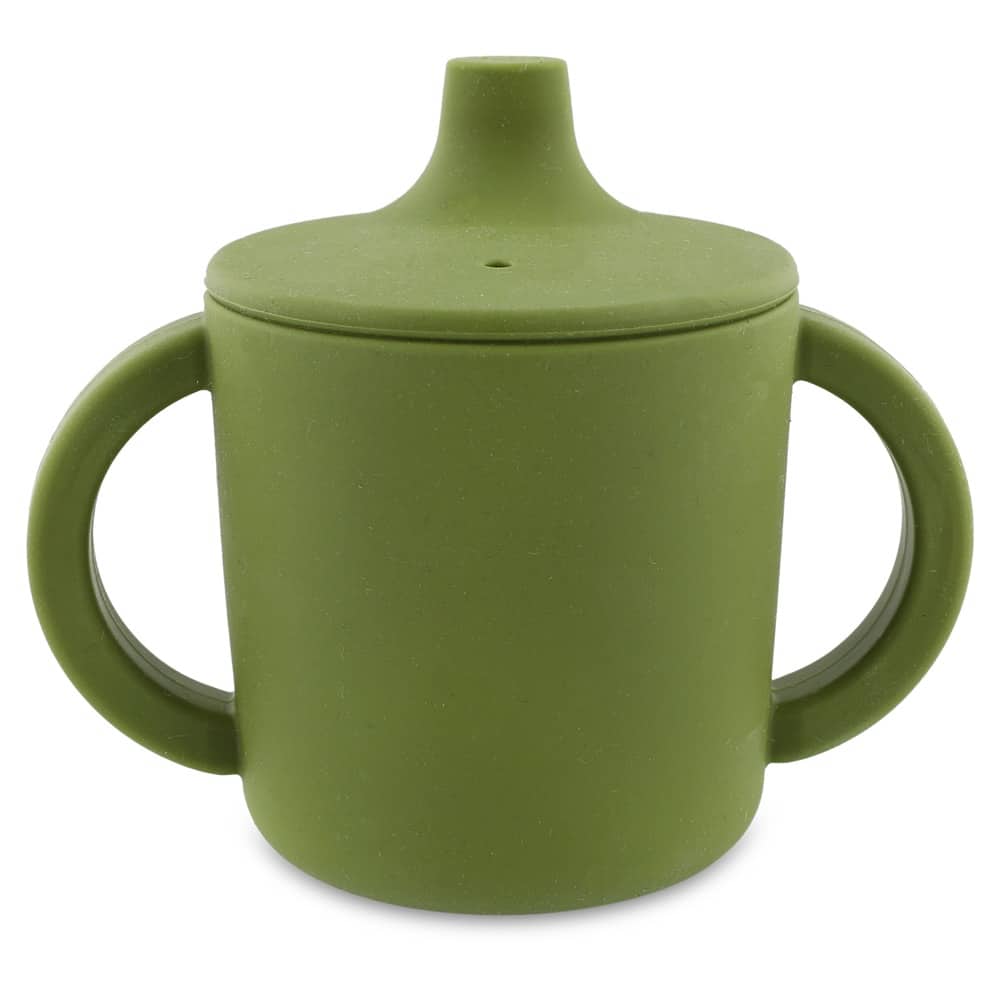 Taza infantil de silicona alimentaria con diseño de dinosaurio. Ligera, antideslizante y con asas ergonómicas, ideal para fomentar la autonomía en los más pequeños.