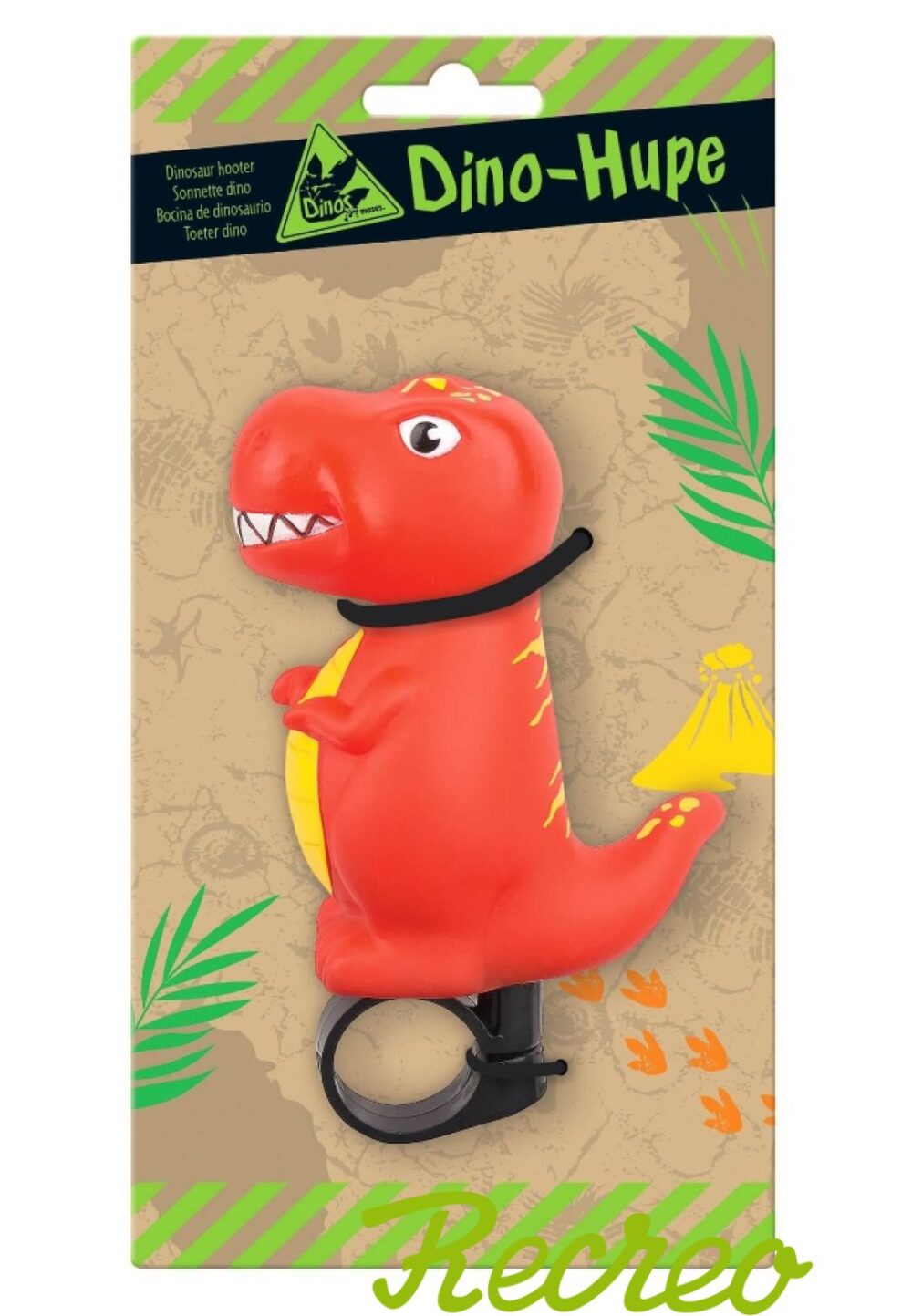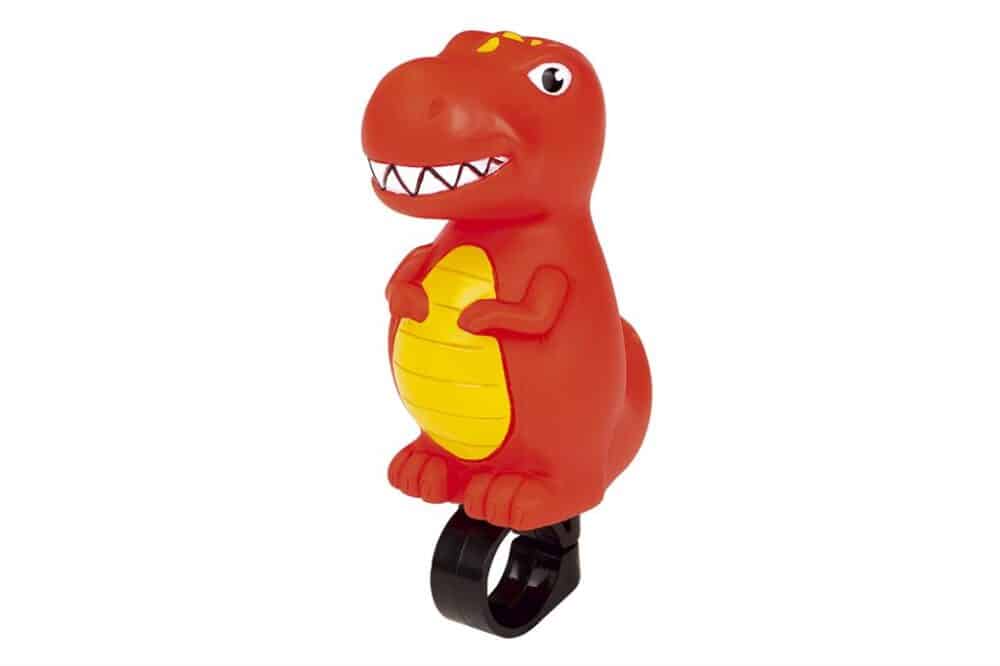 Timbre ajustable para bicicletas modelo Dinosaurio color rojo.