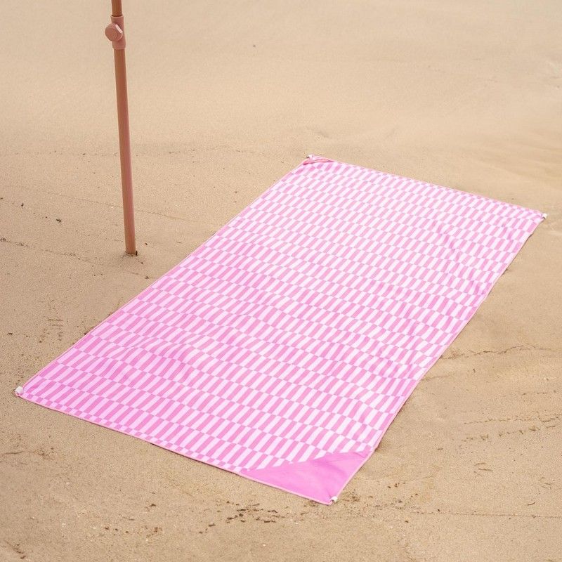 Toalla de microfibra Honey Rosa de Flamingueo, con diseño a rayas y tejido ultraligero. Perfecta para la playa, la piscina o escapadas. Compacta, absorbente y de secado rápido.