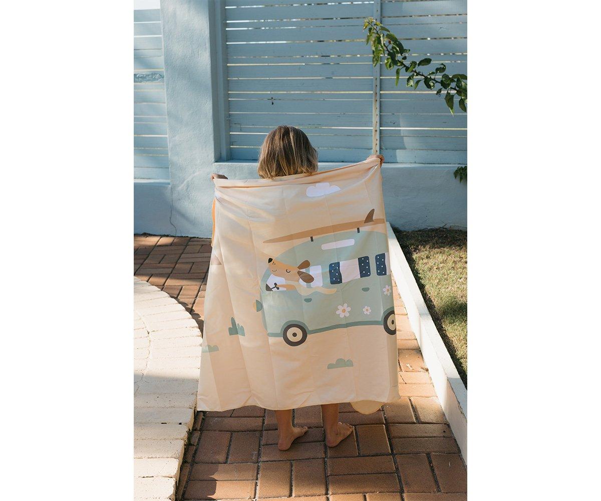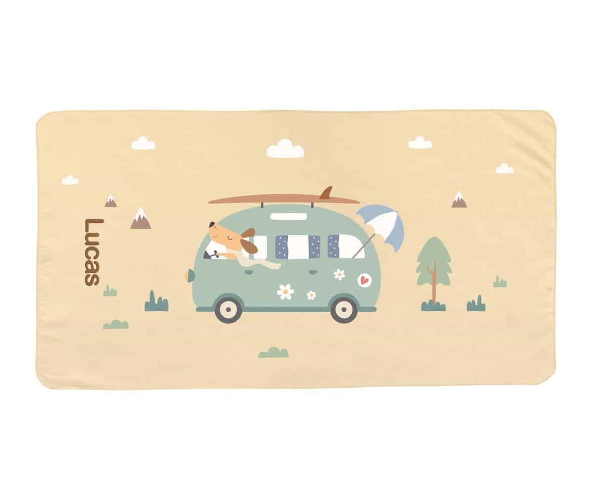 La Toalla Surf Van es ideal para la playa o la piscina. Compacta, absorbente y de secado rápido, incluye una funda de malla transpirable para transportarla cómodamente. Personalízala con el nombre de tu peque para un detalle especial.