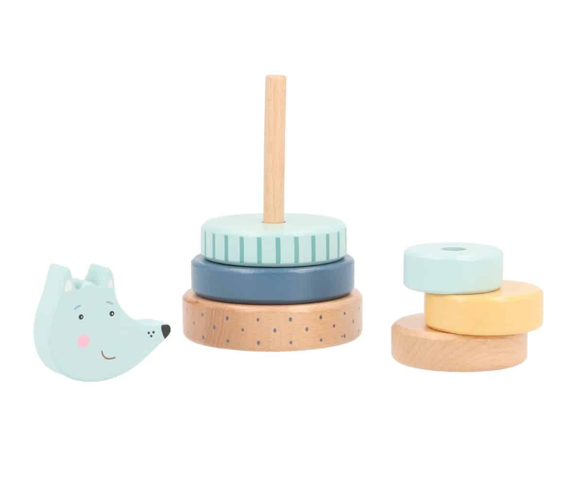 • 6 piezas apilables (incluye la cabeza del lobo).